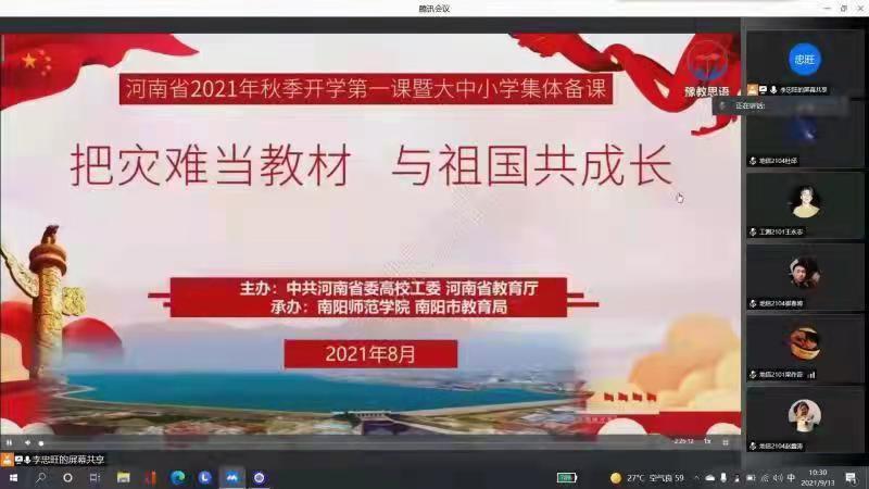 班会由辅导员李忠旺主持,同时邀请了测绘工程学院18名大二的优秀学生干部和一些精于学习、乐于生活的学长参加。辅导员首先恭喜同学们成长为一名大学生,这是人生一次里程碑的跨越,在新的人生阶段和新的环境,通过自己的努力奋斗,丰富自己的多彩人生。告诉同学们,步入大学,首先要做好规划,我的青春我做主,各位学长根据自身经历、体会和经验,悉心解答了各位大一新同学提出的问题,真正达到了学风共建,经验共通的预期效果,发扬了测绘工程学院新老互助、建设和谐大家庭的优良传统。最后和同学们一起,观看了河南省2021秋季开学思政第一课。