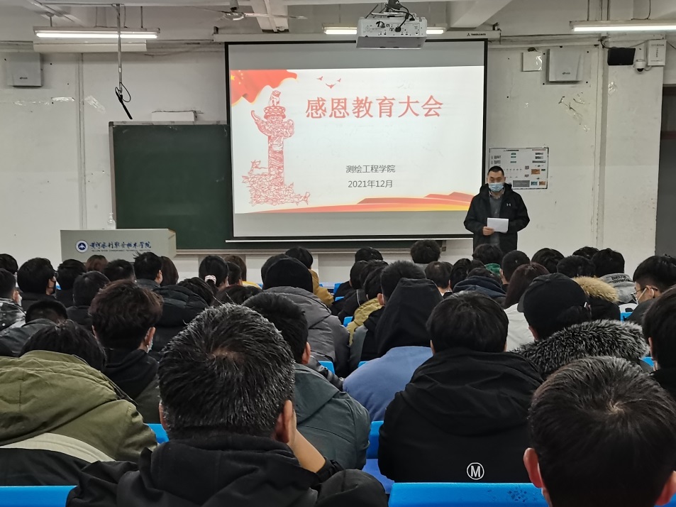 感恩教育有利于提高大学生的人文素质和社会适应能力。人文素质的高低直接影响大学生走向工作岗位后适应社会的能力,也是决定大学生综合素质的重要因素。为此,12月10日,测绘工程学院于JX2302开展了感恩教育大会。测绘工程学院党总支副书记彭战松、辅导员韩清清、教师胡苗苗和学生代表参会。