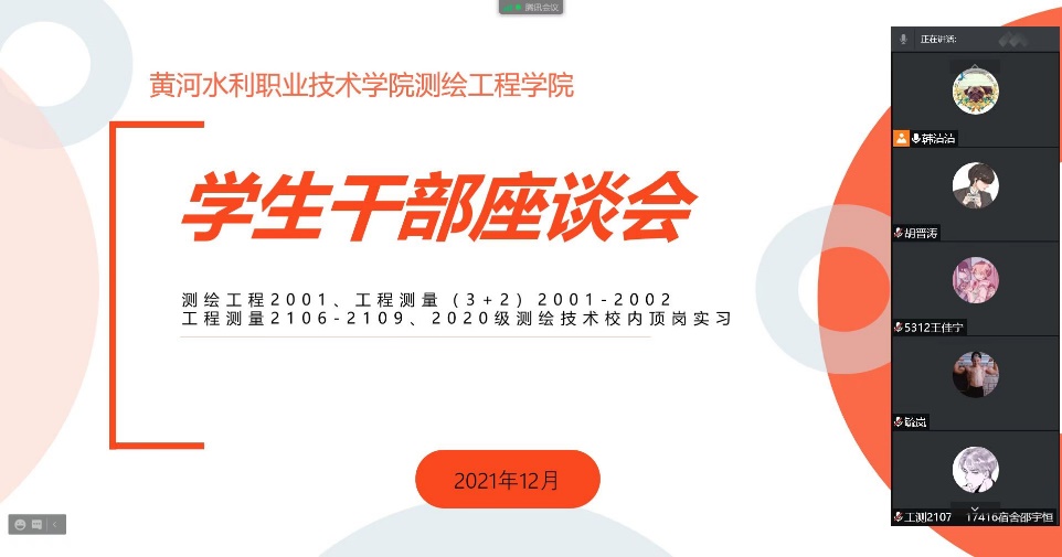 为更好的统筹学生管理工作,12月19日中午,韩清清老师召开线上学生干部座谈会。参加此次会议的有测绘工程2001班、工程测量(3+2)2001-2002班、工程测量2106-2109班等班级委员。