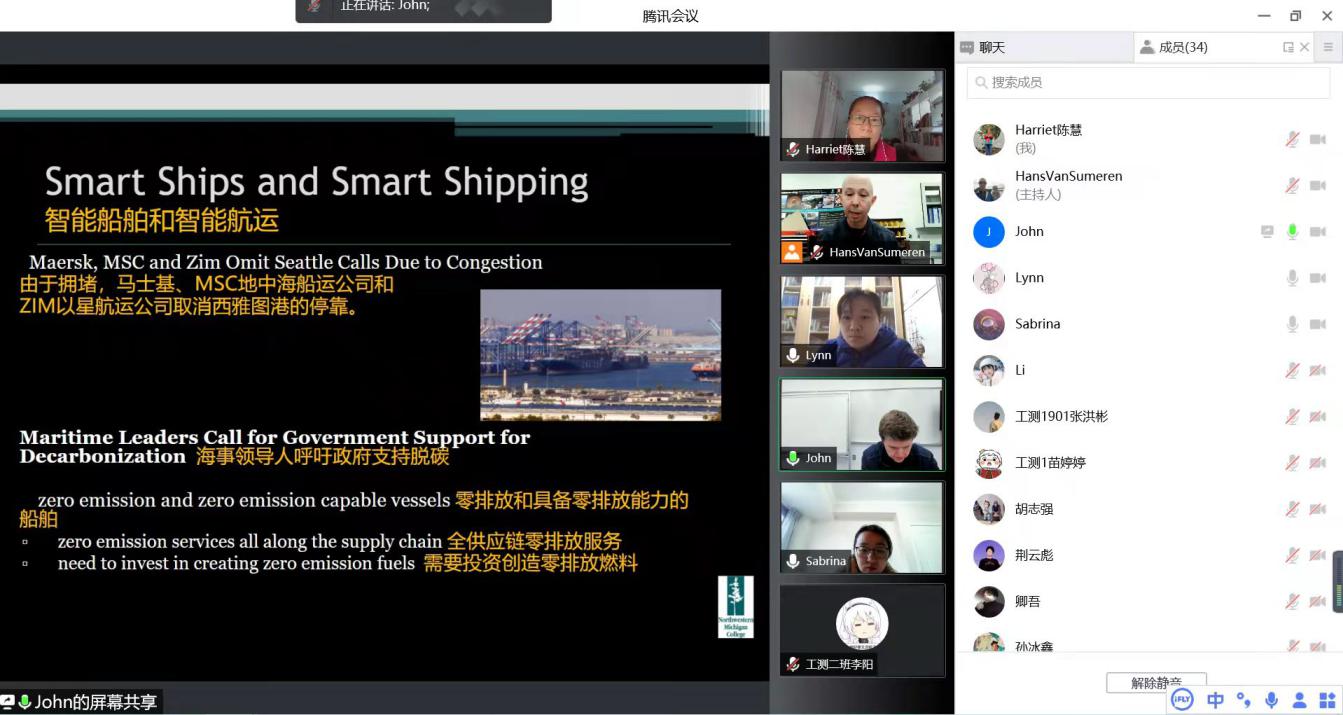 2021年底,新冠疫情仍在持续中,2019级工程测量技术专业(中外合作办学方向)的同学们开启了新一轮的跨国跨年海洋技术网课。网课安排在寒假期间,由美国西北密歇根学院教师HANS和JOHN主讲,以“腾讯会议-voov meeting”平台为主、以微信群为辅开展网络课堂教学,测绘工程学院教师陈慧会同国际教育教师蔡蓓和段丽娜进行辅助管理和课堂翻译工作。