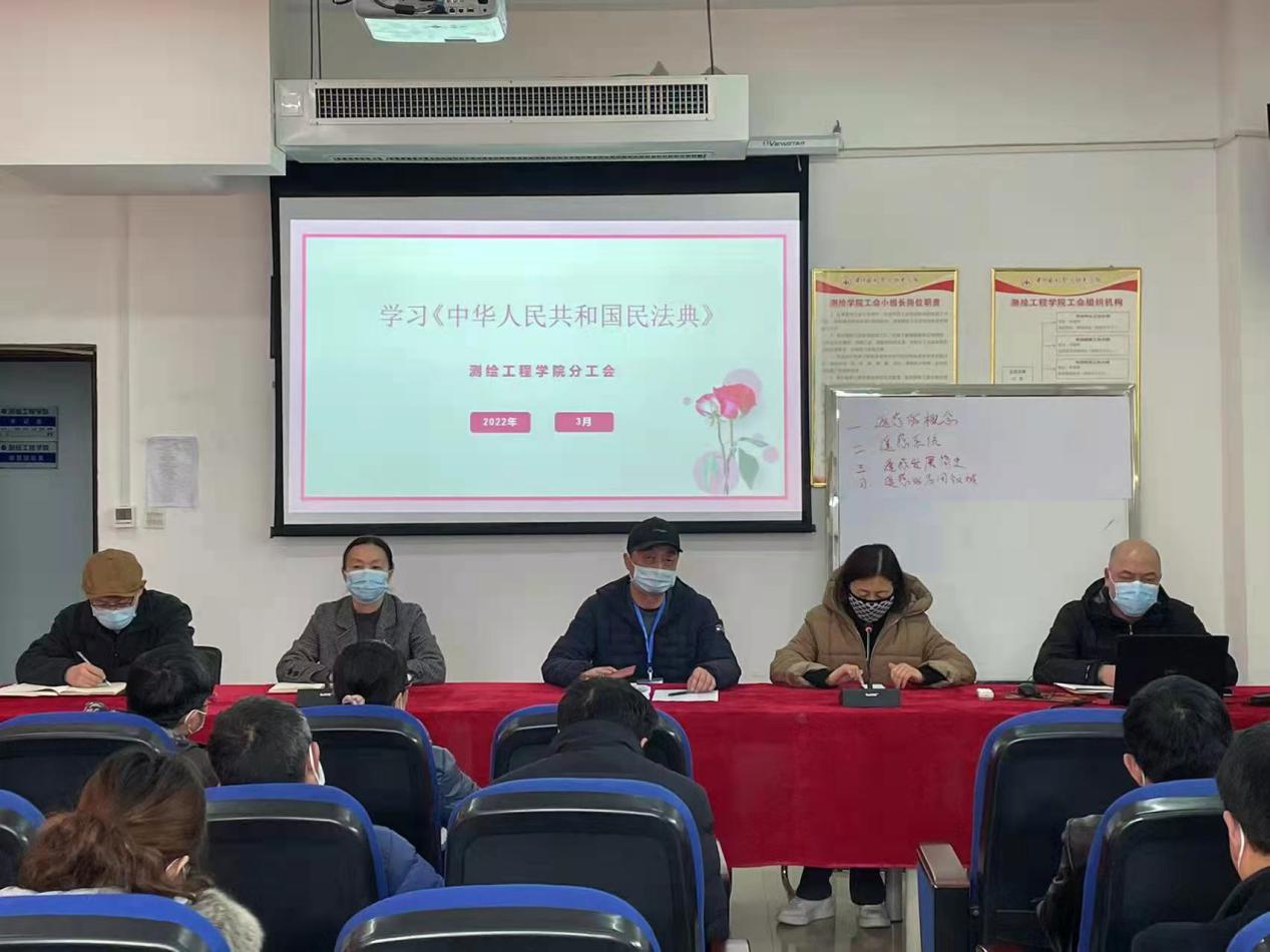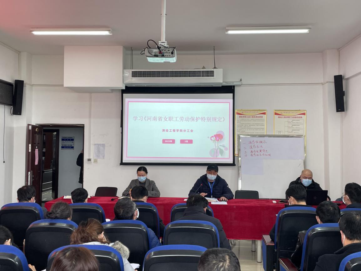 为相应校工会针对“三八”妇女节系列活动对开展“建设文明校园-巾帼在行动”女教职工维权月活动的要求,3月22日,测绘工程学院工会组织女教职工集体学习了《河南省女职工劳动保护特别规定》、《中华人民共和国反家庭暴力法》和《民法典》等法律法规知识,并进行了女教职工劳动保护监督自查,旨在保障女教职工合法权益,提升女教职工维权意识,建设和谐文明校园。
