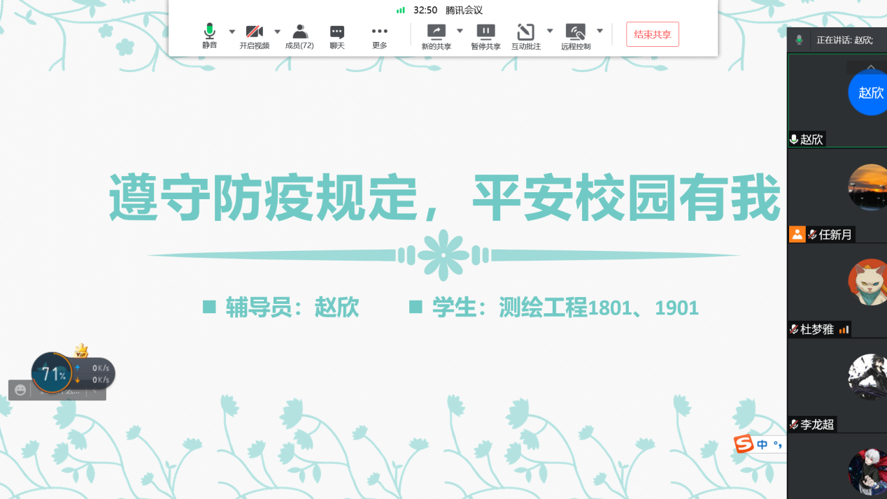 为落实国家、学校的决策部署,始终做好校园疫情防控工作,3月21日,赵欣老师为测绘工程1801、测绘工程1901召开“遵守防疫规定,平安校园有我”疫情防控主题班会。