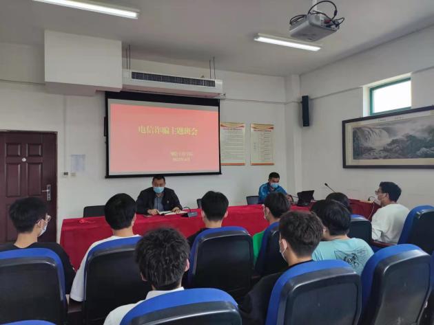 2022年4月11日,测绘工程学院在SY5434召开防电信诈骗主题班会。班会由辅导员李忠旺主持,并邀请总支副书记彭战松为本次电信诈骗主题班会讲话。