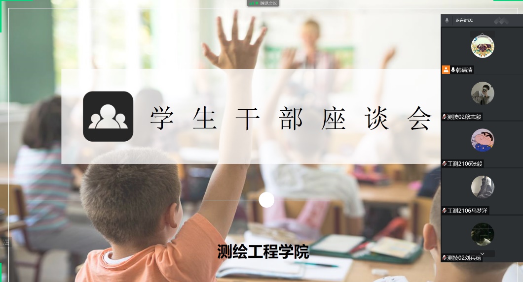 为更好的了解学生的学习和生活,加强学生干部的责任意识,加大学生干部在学生管理中的作用,4月22日,韩清清老师召开学生干部座谈会。参加此次会议的有测绘技术2001-2003班和工程测量2106-2109班的班长、学习委员和宿舍长。
