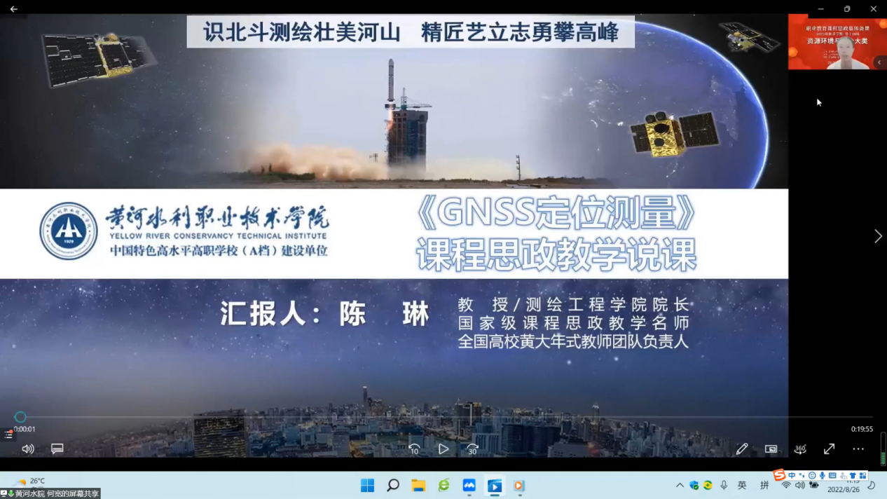 测绘工程学院陈琳、何宽、郭玉珍三名教师代表国家级课程《GNSS定位测量》思政示范课建设团队介绍课程思政建设情况及课程思政的教学展示。