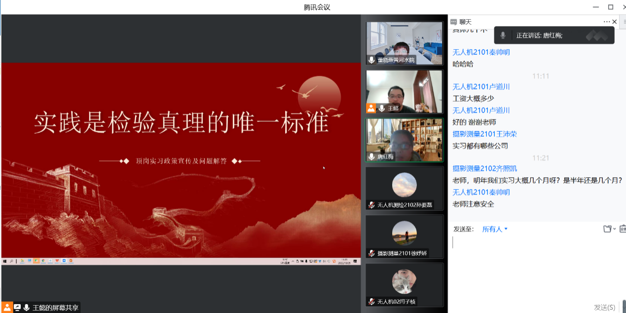 10月29日上午10点,摄影测量教研室专业教师王懿、董晓燕和唐红梅为我院2021级摄影测量与遥感专业和2021级无人机测绘专业学生召开了一场题为:实践是检验真理的唯一标准——顶岗实习政策宣传及问题解答。为同学们介绍顶岗实习政策,解答同学们关心的顶岗实习热点问题。