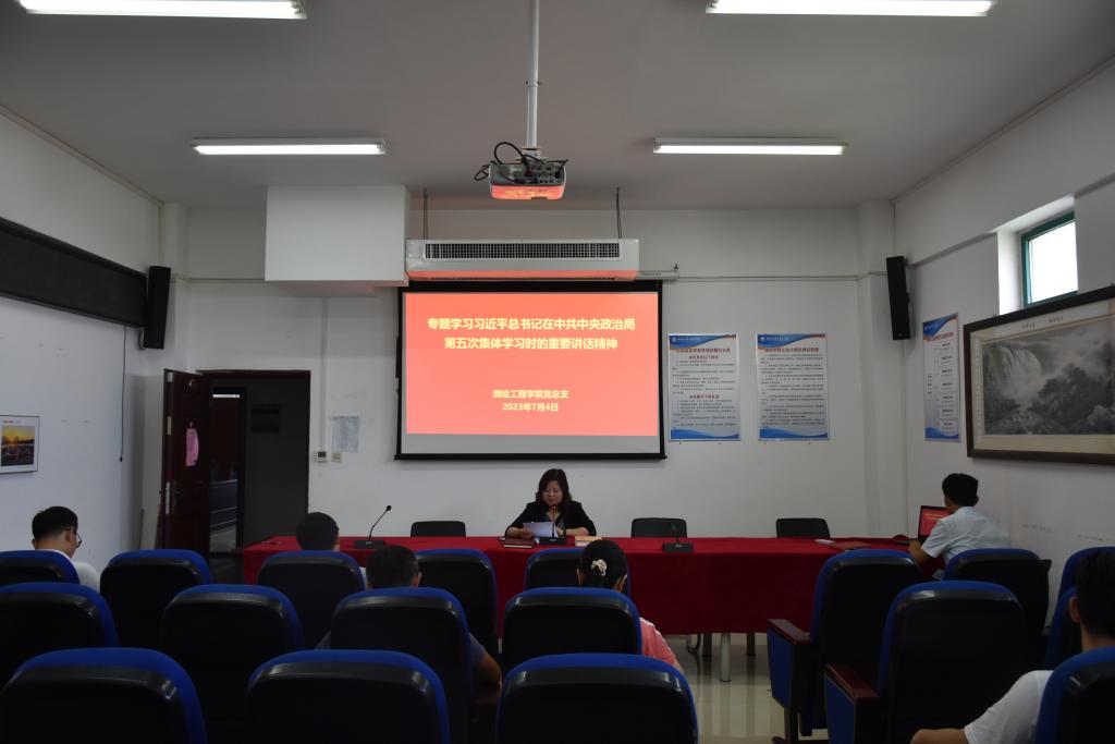 为深入贯彻学习习近平总书记在中共中央政治局第五次集体学习时的重要讲话精神,7月4日,测绘工程学院全体教师党员在SY5434会议室召开专题理论学习会议,会议由党总支书记高琼领学。