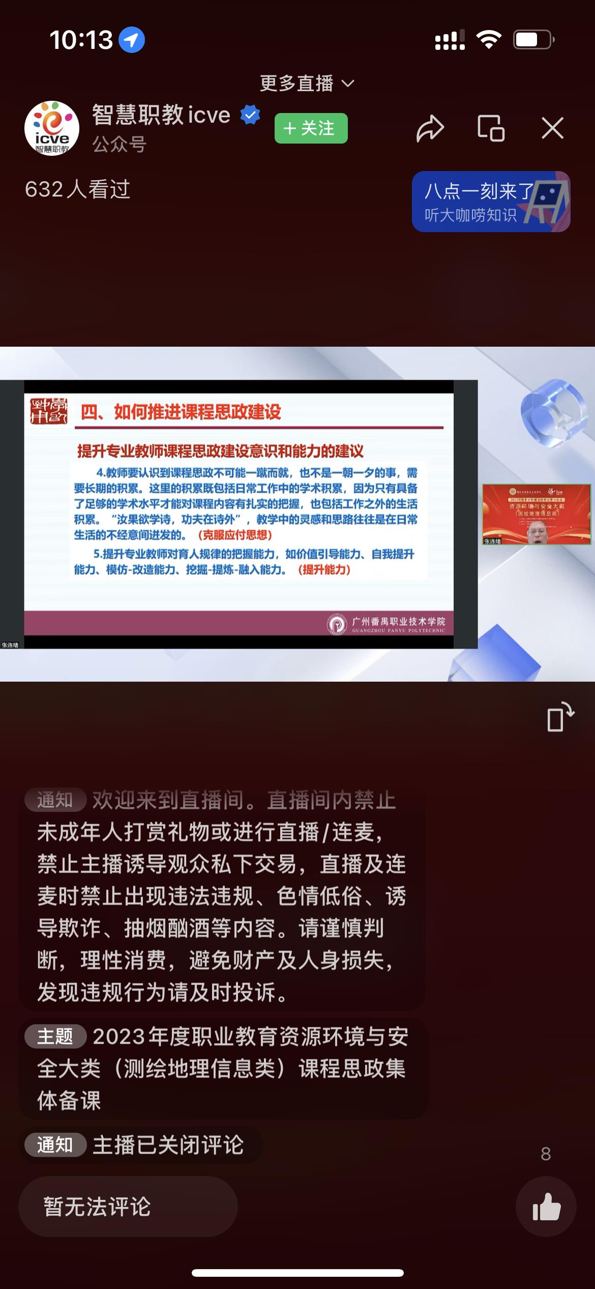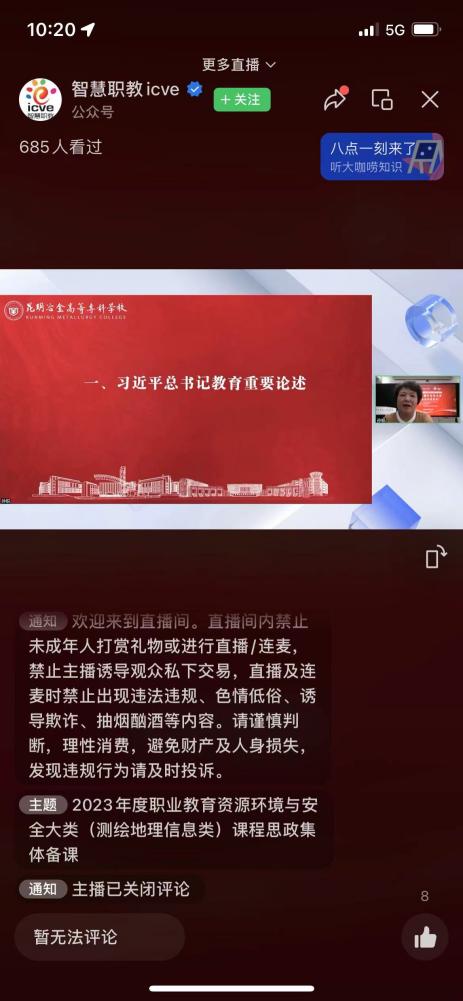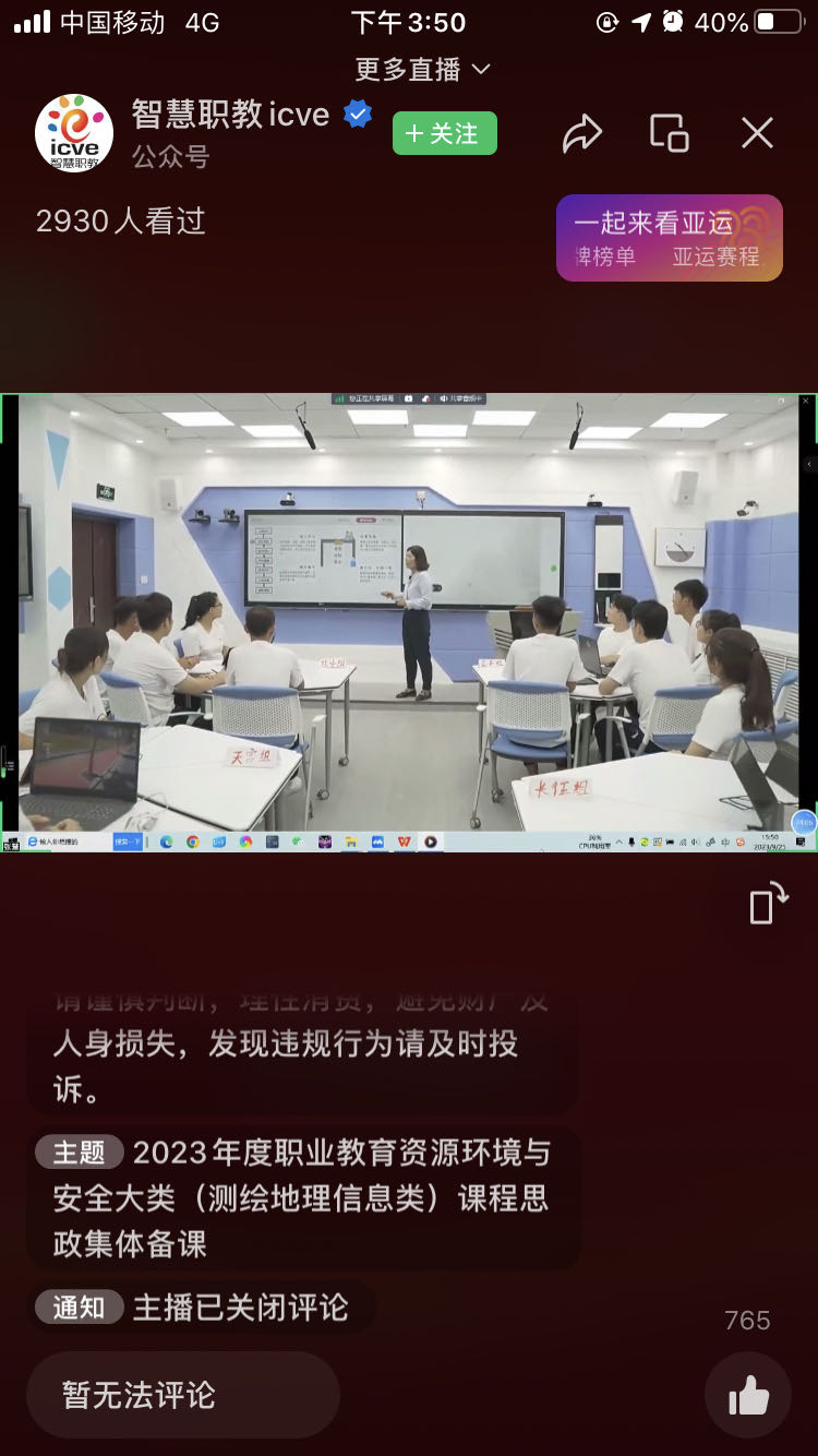 2023年9月25日,测绘工程学院全体教师参加了智慧职教平台线上举办的2023年度课程思政资源环境与安全大类(测绘地理信息类)集体备课活动,国家级课程思政示范课程《GNSS定位测量》团队负责人何宽及团队成员陈琳、陈慧,代表bet36365路检测中心进行了课程说课和课堂教学展示,其余教师也参加了线上学习。