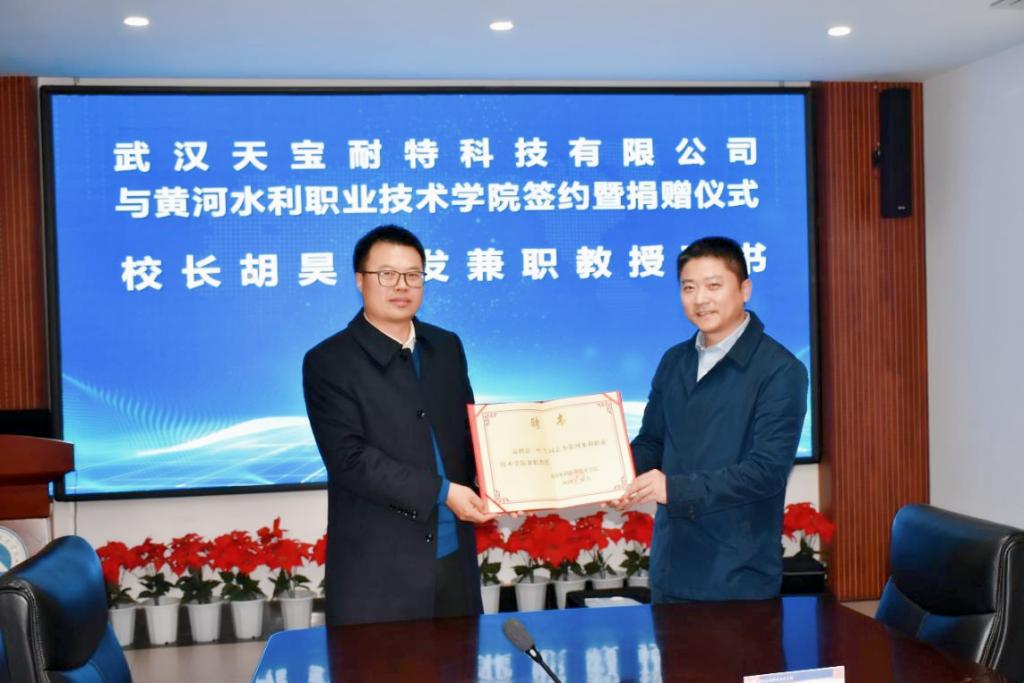 校党委副书记、校长胡昊代表学校接受了企业捐赠,并与武汉天宝耐特总经理叶飞达成共识,双方将积极推进人才培养、产教融合项目开发、科研与技术服务等深度合作,逐步将产教融合落实到数字孪生水利和坝道工程医院智能监测等科研前沿应用上。最后,胡校长为叶飞总经理颁发兼职教授聘书。