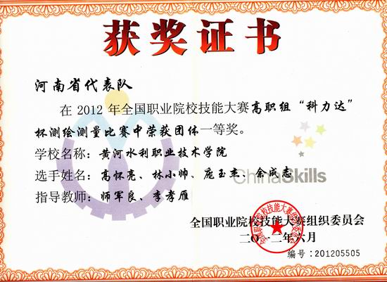 6月22日至26日,2012年全国职业院校技能大赛高职组测绘测量赛项在河南工业职业技术学院如期举行,来自全国27个省(直辖市、自治区)53支代表队的200多名参赛选手参加了比赛。由我院测绘工程系主任赵杰带队,周建郑、师军良、李孝雁、朱曙光指导,庞玉杰、高怀亮、余成志和林小帅组成的我院代表队(河南省一队)发挥出色,一举囊括本赛项中“数字测图”、“二等水准测量”和“计算器编程”三个分项目的一等奖,并获得团体一等奖。师军良、李孝雁两位老师获得“优秀指导教师”,庞玉杰同学获得“国家测量技师”资格,高怀亮、余成志和林小帅三位同学获得“国家三级测量员”(高级工)资格。