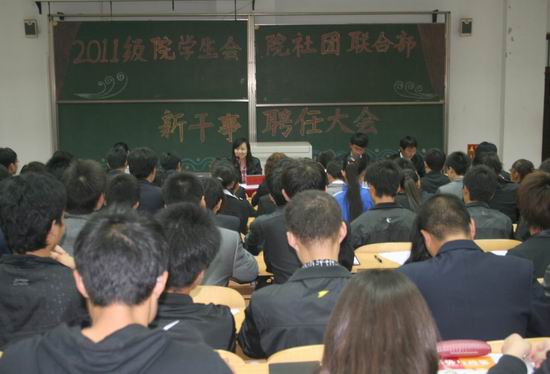 10月21—11月16日,院团委举办了2011级院学生会和社团联各部新成员聘任大会和干部培训班。此次院学生会和社团联各部共招聘新干事285名,试用期一个月。