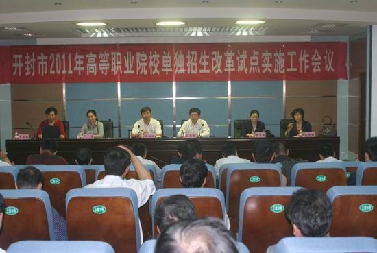4月29日上午,2011年高等职业院校单独招生改革试点实施工作会议在我院学术报告厅隆重召开。开封市招生办副主任文柏松、我院领导刘国际、刘紫婷,市招办综合科科长李秀英、普招科科长叶洁,我院招生就业与工学办主任于兆国出席了会议,开封五县招生办负责人、开封地区四十余所高中(中职)相关领导等共80余人参加了会议。会议由副院长刘紫婷主持。