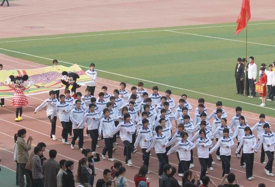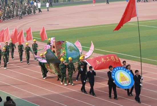 上午8点30分,伴随着激昂的运动员进行曲,国旗护卫队和彩旗队首先入场,他们以飒爽的英姿守护着鲜艳的五星红旗,迈着整齐矫健的步伐,喊着铿锵有力的口号,精神饱满的从主席台前走过,拉开了此次大会的帷幕。随后,全院14个系部代表队迈着整齐有序的步伐相继入场。他们身着整齐的服装,踏着欢快的军乐,展现着各系独有的活力与特色,充分彰显了我院学子昂扬的精神风貌。环化系方阵打出了“绿色、环保、健康、和谐”等口号,既展现了系办学特点,也倡导了环保健康的人文观念;土木系的地球莲花模型,突出了独特的建筑风格;测绘系的女子方阵身着女式迷彩军装,英姿飒爽,表现着巾帼不让须眉的昂扬士气;财经系和管理系方阵以一群直飞云天的白鸽,赢得了现场观众的阵阵欢呼;信息工程系方阵将网络游戏中的动漫人物带到了现实,充分展示了动漫游戏专业的特色;旅游系、艺术系方队色彩缤纷的着装则给人以亮丽清新的感觉。