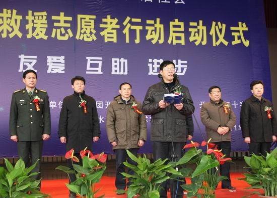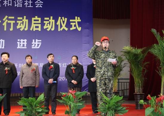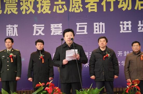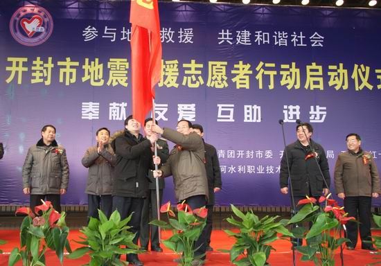随后,与会领导共同为开封市救援志愿者服务县区大队授旗,修济刚局长为开封市地震救援服务总队授旗。仪式上,我院青年志愿者代表郝友同学带领全体志愿者做地震救援志愿者宣誓;各位领导还为我院青年志愿者代表发放了救援急救包。