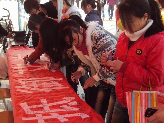 当日上午,我院在扬帆大道举行了以“爱心呵护生命,行动抵御艾滋”为主题的预防艾滋病宣传日活动大型签名活动,全院学子踊跃签名。活动通过悬挂横幅,张贴宣传海报,发放传单等多种形式,向全院学生宣传、讲解了艾滋病防控等内容,使广大师生了解并掌握预防艾滋病的相关知识,增强预防艾滋病的意识。活动人员胸佩红丝带,号召大家要珍爱生命、消除歧视,争做红丝带精神的传承者、预防艾滋病知识的传播者、关爱艾滋病感染人员的爱心使者和预防艾滋病人的实践者。