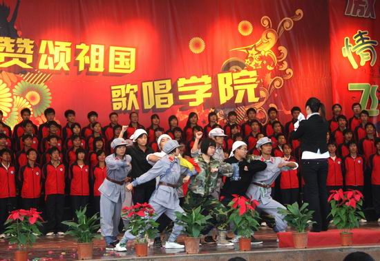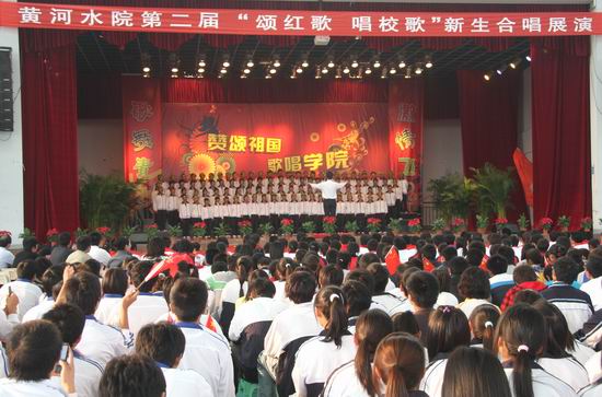 展演活动中,全院14个系组成的14支合唱队参加了展演,演唱了《校歌》、《歌声与微笑》、《团结就是力量》、《长江之歌》、《爱我中华》、《红旗飘飘》等爱国歌曲。同学们以高昂的歌声、整齐的服装、优美的舞蹈,演绎了对祖国的热爱和对学院的祝福。激昂的歌声铿锵有力,唱响了黄河水院,震动了中华大地;刚劲的功夫、柔美的舞姿展示了2010级新同学的多才多艺与饱满的精神风貌。精彩的演出令现场的掌声、欢呼声不断,声声震耳。