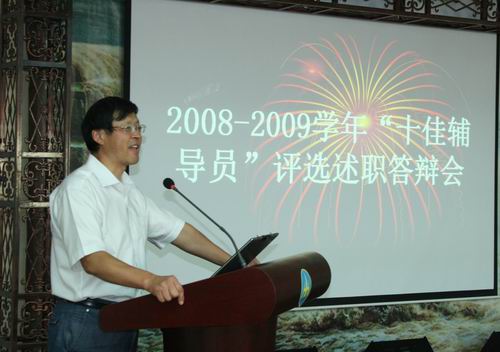 8月27日上午,我院学生工作部(处)在现代技术教育中心演播大厅组织了2008-2009学年“十佳辅导员” 评选述职答辩会。院党委副书记、纪委书记王卫东出席会议并讲话。担任此次评选答辩的评委有各系(部)分管学生工作的领导和相关职能部门的负责同志,答辩会由学生处宿舍管理科科长柴杉主持。