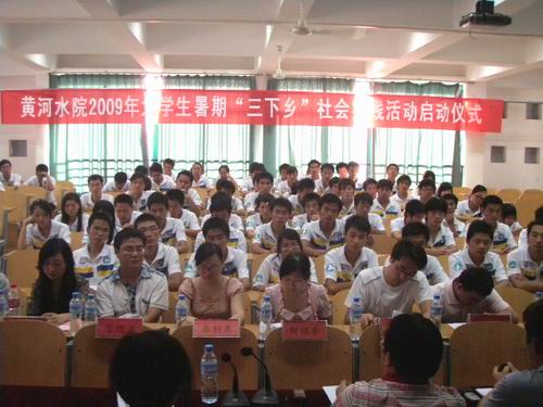下午,我院2009年暑期“三下乡”社会实践活动启动仪式在教学楼6302室举行,活动以“青春献祖国 实践促成长”为主题。院团委书记周志琦、副书记谷献晖、团委部分人员、各系部分团委书记,以及即将奔赴各地开展“三下乡”的志愿者200余人参加了仪式。仪式由院团委郝黎闻主持。