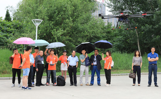 陶本藻教授观看无人机航空摄影测量演示(艺术系来卫东老师摄)