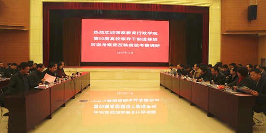 11月12日,国家教育行政学院第50期高校领导干部进修班33名学员来36365官网考察调研。校领导刘国际、茹正波、刘紫婷、杨士恒、张豫东、刘卫锋等热情接待了来访嘉宾。党政办、党委组织部、党委宣传部、教务处、科技处、人事处、学生处、水利工程学院、土木与交通工程学院、测绘工程学院、机械工程学院、旅游系等部门的负责人参加了座谈交流活动。