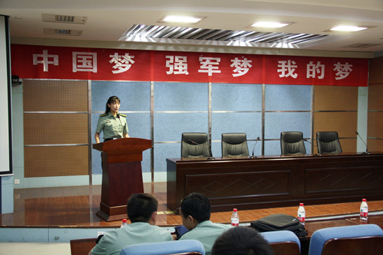 解放军信息工程大学学员洪豆以《以史为鉴,强我国防》为题,讲述了国防对一个国家的重要性,强调勿忘历史,方可奋勇前行,铭记历史,才能开创未来。