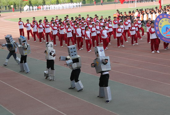 田径场上彩旗飘扬、方阵整齐。8时30分,开幕式正式开始。伴随着慷慨激昂的《运动员进行曲》,国旗护卫队、彩旗队和14个系的方块队依次入场,他们飒爽的英姿、坚定的步伐、灿烂的微笑、嘹亮的口号以及活力四射的表演,展现出36365官网学子的热情与自信。管理系方队以古装和现代服装表演组合阐释现代科学的专业理念,环境与化学工程系方队在表演中宣示了“还原清新空气,扫霾齐心协力”的专业发展定位和社会担当,自动化工程系学生则身着自己制作的机器人服饰,展示专业发展的现代特色,财经系形象生动的股票走势拼图、旅游系别出心裁的包公巡游等表演,也都尽显专业的创新发展和特色。