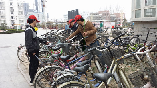 “小红帽”志愿者在整顿乱停放的自行车