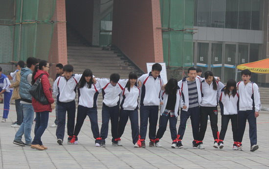 “穿越电网”是经典素质拓展活动之一,要求所有队员必须在身体不碰触电网的任何一部分的情况下,从大小不一的网孔中穿越到电网的另一边,很多同学都是第一次接触这个项目,大家抛开平日里的羞怯,开动脑筋,积极为团队献计献策,共同制定穿越攻略,在规定时间内,大部分队员通过队友的帮助成功实现穿越,没有成功的队员也在赛后积极反思、总结经验。“突破雷阵”项目一方面考验队员的方向感,另一方面考验队友之间的配合,带上眼罩的队员通过旁边队友的提示穿过有障碍的雷区,取得解救队员的钥匙,参加该项目的各位同学积极配合,认真听取队友的指挥,表现出良好的团队合作精神。“球行千里”项目则最考验参赛队员的配合程度,两位队员背靠背,双方步调一致才能将气球成功运送到目的地,有的队员采取前后走,有的队员采取左右行,在最短的时间内将气球运送到目的地。“十人九足”项目的运动员腿绑着腿,心连着心,齐声高喊着“一二一,一二一”,向终点奔跑。“火车快跑”项目比赛中,一个队10名队员右手搭肩膀,左手抬着前面队友的腿,步调整齐一致,形成一列快速移动的小火车。在长达3个小时的比赛中,没有任何一位队员提出中途退出,真正做到不抛弃、不放弃。在遇到失败时参赛队员也不气馁,互相鼓励,共同喊出系代表队的队名和口号,呐喊出属于当代大学生的青春和热情。