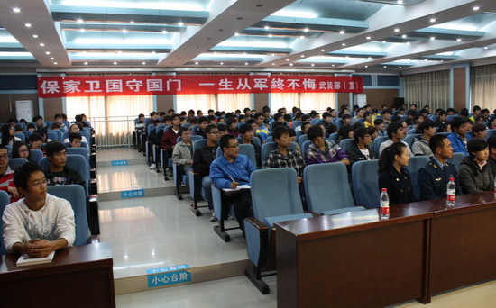 为迎接党的十八大胜利召开,激发广大青年学生参军报国热情,11月2日上午,“富国强军”国防教育演讲团莅临我院,为全院学生做了一场精彩的报告会。报告会围绕“军民融合和兴中原”、“以史为鉴,强我国防”、“如火的青春,无悔的选择”、“军人,我一生的骄傲”等主题,深刻地表达出当代大学生积极参军、报效祖国的热情。