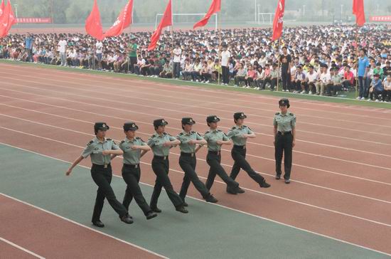 动员会最后,承训的驻汴某部军训团女教官为新生进行了精彩的军事队列科目演示。