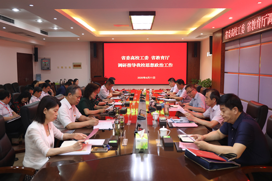 6月11日下午,以省委高校工委专职委员何秀敏为组长的省委高校工委 省教育厅调研组一行5人到36365官网开展高校思想政治工作专题调研。座谈会在36365官网行政楼第二会议室举行,全体校领导出席会议,党政办公室、党委组织部、党委宣传部、学生工作部、教务处、教师工作部、保卫部、校团委、马克思主义学院、科技处等部门负责人参会。座谈会由校党委书记周保平主持。