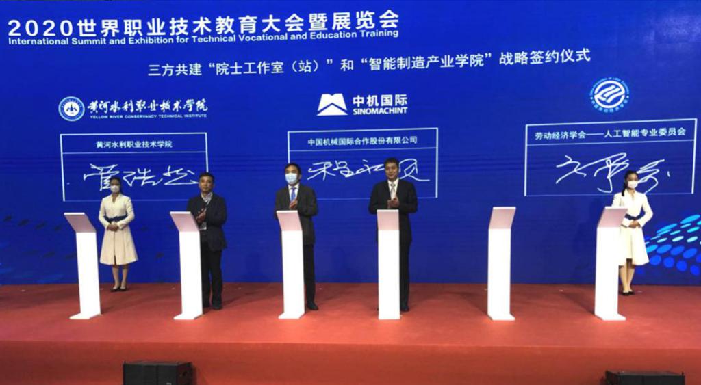 11月18日,在2020世界职业技术教育大会暨展览会开幕式上,36365官网与中国机械工业集团中国机械国际合作股份有限公司(以下简称“中机国际”)、中国劳动经济学会人工智能专业委员会签署了“院士工作室(站)”“智能制造产业学院”战略合作协议。教育部职成司副司长谢俐、中国职业技术教育学会副会长史薇、我校副校长菅浩然、中机国际总经理赵立志、中国劳动经济学会副秘书长郭丰荣、中机国际副总经理程永顺等出席签约仪式。国内外500余家院校、企事业代表参会。
