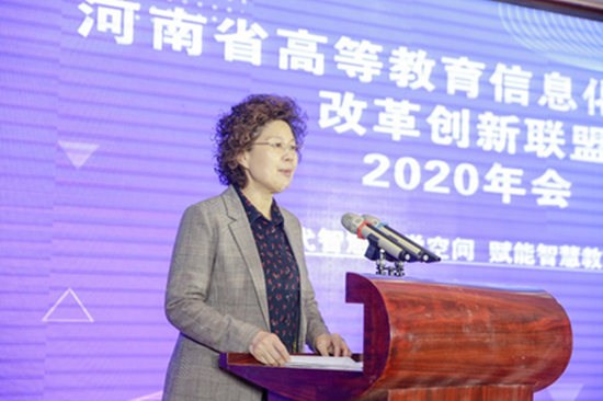 教育厅科技信息化处调研员施晓春致辞,总结了河南省各个高校优秀的信息建设成果。她指出,在教育信息化2.0时代,信息技术深度融入基础教育各个领域,推动着教育资源、学习模式、教育管理和教育评价等核心要素的持续变革与创新,为教育改革带来了诸多机遇。