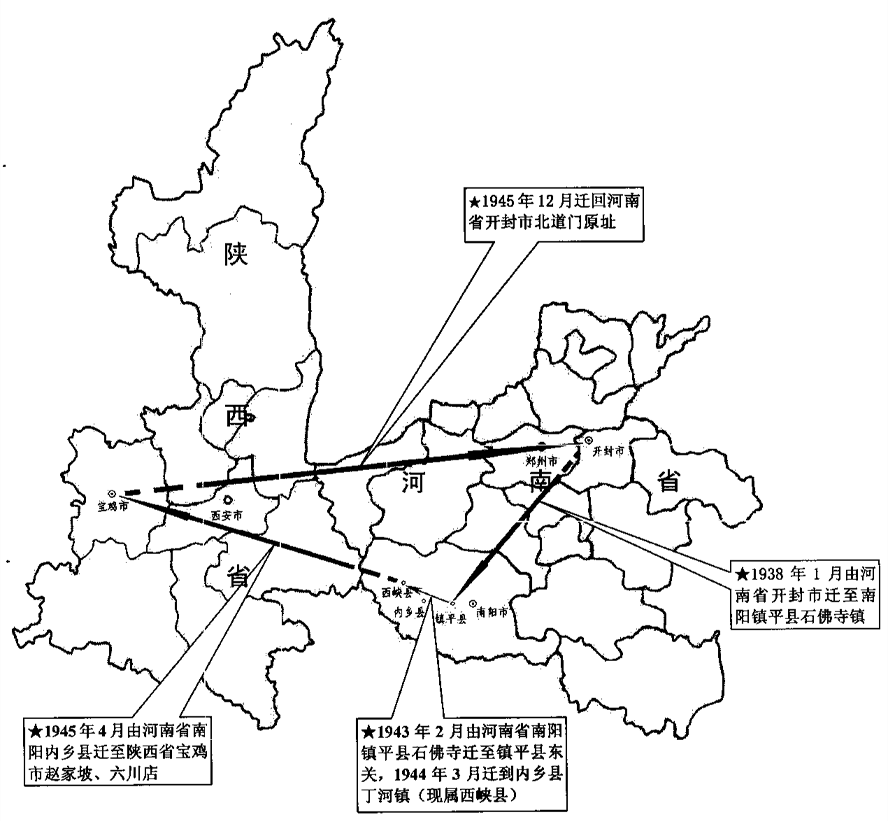 随着日军南侵,形势紧张,1944年3月,学校又迁到内乡县丁河镇(现属河南省西峡县),专科部驻丁河、邪地两村,高职部驻北峪村,师生分散居住在丁河、邪地、北峪三村民房内。