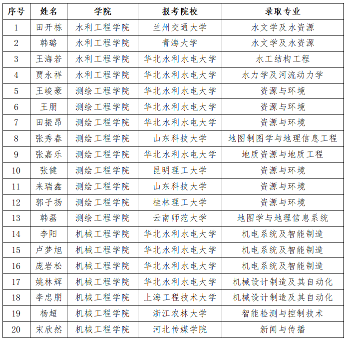 近日,2021年全国硕士研究生录取结果陆续揭晓,36365官网与华北水利水电大学联办的本科2021届毕业生考研捷报频传,20名学生顺利考取华北水利水电大学、兰州交通大学、昆明理工大学等高校硕士研究生。