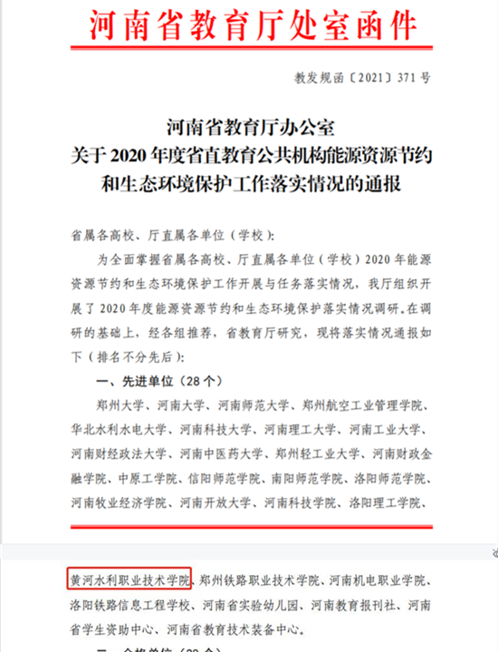 近日,河南省教育厅下发《关于2020年度省直教育系统公共机构能源资源节约和生态环境保护工作落实情况的通报》(教发规函〔2021〕371号),36365官网再次获评为省直教育系统公共机构节能先进单位,这是继36365官网2016年以来第四次被评定为考核先进单位。