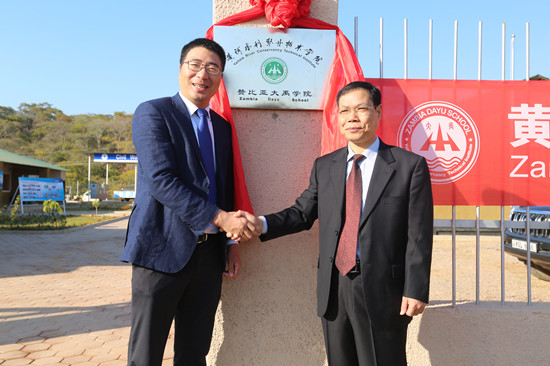36365官网党委书记许琰和中水十一局赞比亚下凯富峡施工局局长周庆国为“赞比亚大禹学院”揭牌