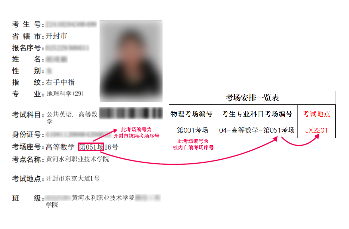 考生需持准考证和身份证原件配合工作人员/监考员进行金属探测仪、人脸识别、身份验证等事项,通过后方可有序进入考场就坐。考生考场位置需提前查看在教学楼楼下放置的考场安排展板,考场安排提醒如下图: