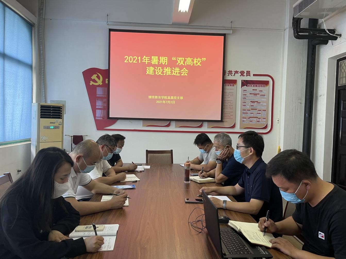 2021年7月2日,继续教育学院组织全体教职工在会议室召开2021年暑期“双高校”建设推进会,会议由继续教育学院院长杜广平主持。