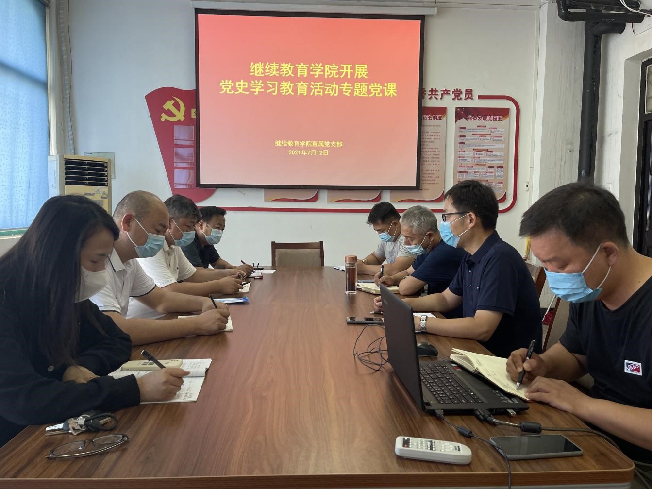 为深入开展党史学习教育,增强学习教育的针对性和实效性,进一步强化党员干部党史学习教育效果,7月12日,继续教育学院组织开展党史学习教育专题党课,党支部书记杜广平同志授课,全体教职工参加。