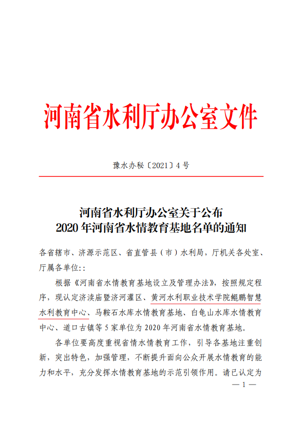 近日,河南省水利厅印发《河南省水利厅办公室关于公布2020年河南省水情教育基地名单的通知》豫水办秘{2021}4号,学校申报成功2020年河南省“水情教育基地”。