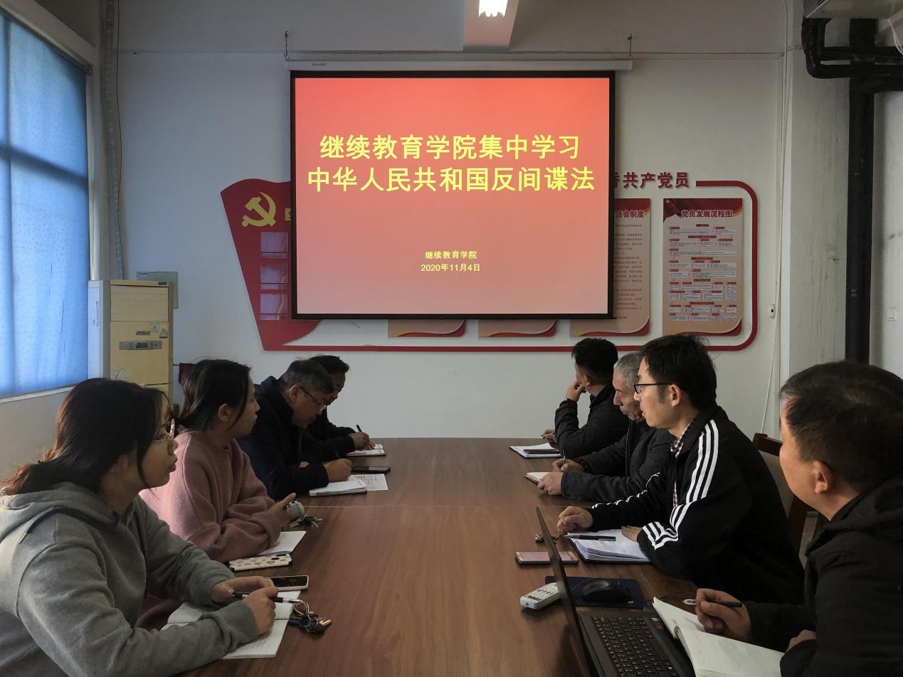 2020年11月4日,继续教育学院组织全体教职工在四号教学楼四楼会议室集中学习《中华人民共和国反间谍法》,会议由院长杜广平主持。