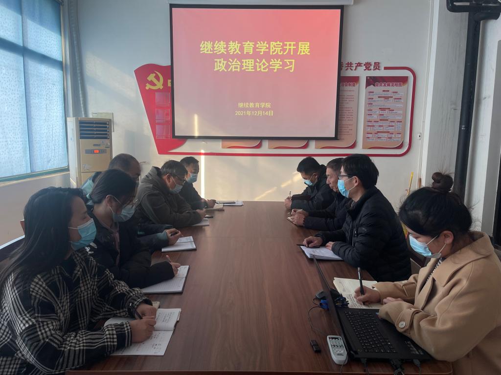 2021年12月14日,继续教育学院在4号教学楼四楼会议室开展政治理论学习,会议由院长杜广平主持,全体教职工参加学习。