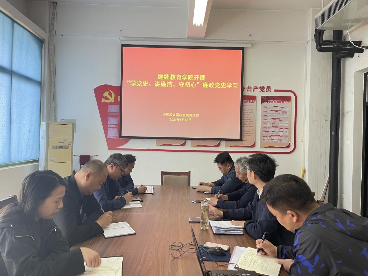 为进一步丰富党史学习教育形式,推动党史学习教育走深走实,2021年5月18日,继续教育学院在4号教学楼4楼会议室开展“学党史、讲廉洁、守初心”廉政党史学习,会议由院长杜广平主持,全体教职工参加。