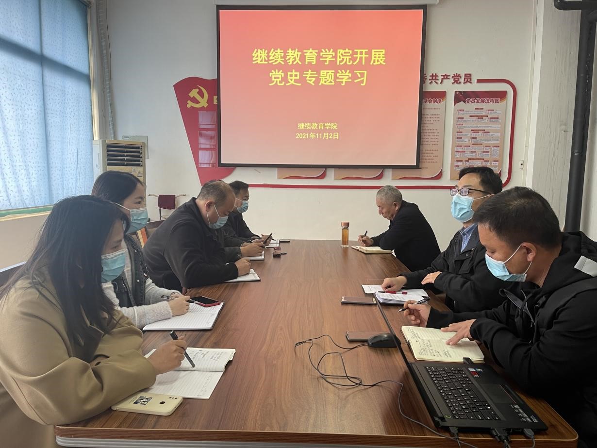2021年11月2日,继续教育学院在4号教学楼四楼会议室开展党史专题学习,会议由院长杜广平主持,全体教职工参加学习。