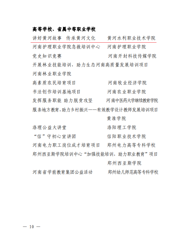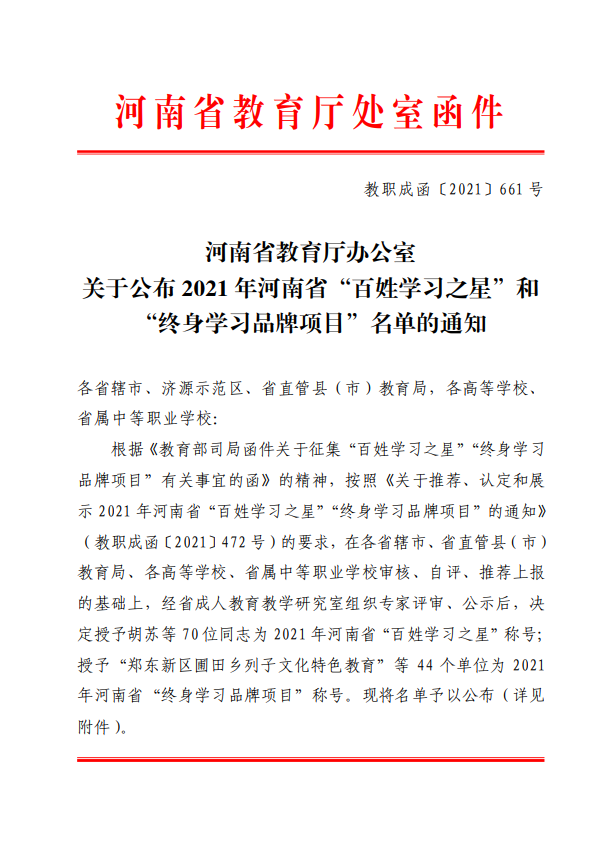 近日,河南省教育厅印发《河南省教育厅办公室关于公布2021年河南省“百姓学习之星”和“终身学习品牌项目”名单的通知》教职成函〔2021〕661号,学校申报的“讲好黄河故事 传承黄河文化”成功入选河南省“终身学习品牌项目”。