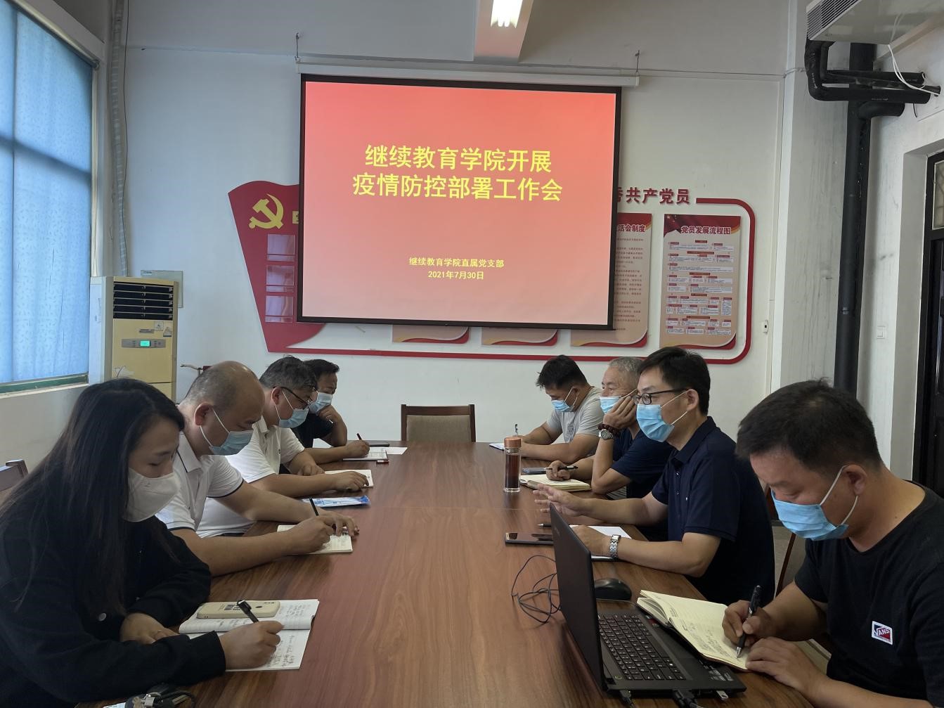 2021年7月30日,继续教育学院组织全体教职工在4号教学楼四楼会议室召开疫情防控部署工作会议,会议由继续教育学院院长杜广平主持。