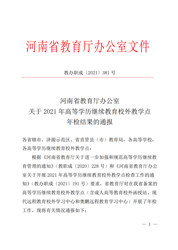根据《河南省教育厅关于进一步加强和规范高等学历继续教育管理的通知》(教职成〔2020〕228号)和《河南省教育厅办公室关于开展2021年高等学历继续教育校外教学点检查工作的通知》(教办职成〔2021〕191号)要求,河南省教育厅对在我省备案的高等学历继续教育校外教学点(含成人高等教育校外函授站、现代远程教育校外学习中心和奥鹏远程教育学习中心)开展了年检工作。
