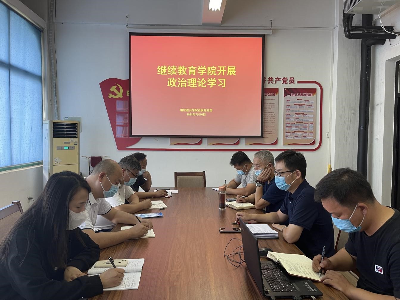 2021年7月10日,继续教育学院在4号教学楼四楼会议室开展政治理论学习,会议由院长杜广平主持,全体教职工参加学习。