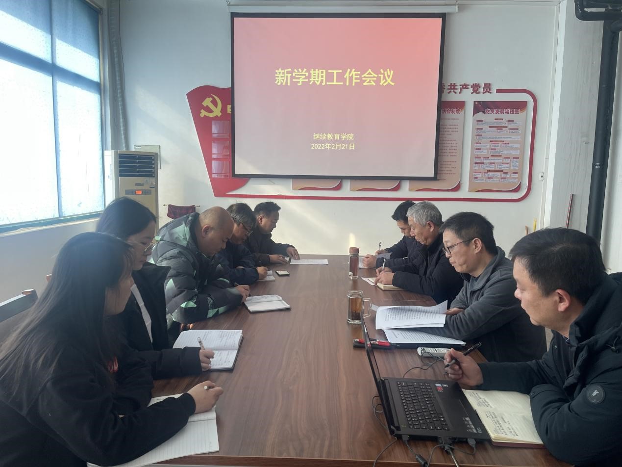 2022年2月21日上午,继续教育学院在四号楼会议室召开新学期工作会议,会议由院长薛建荣主持,全体教职工参加会议。